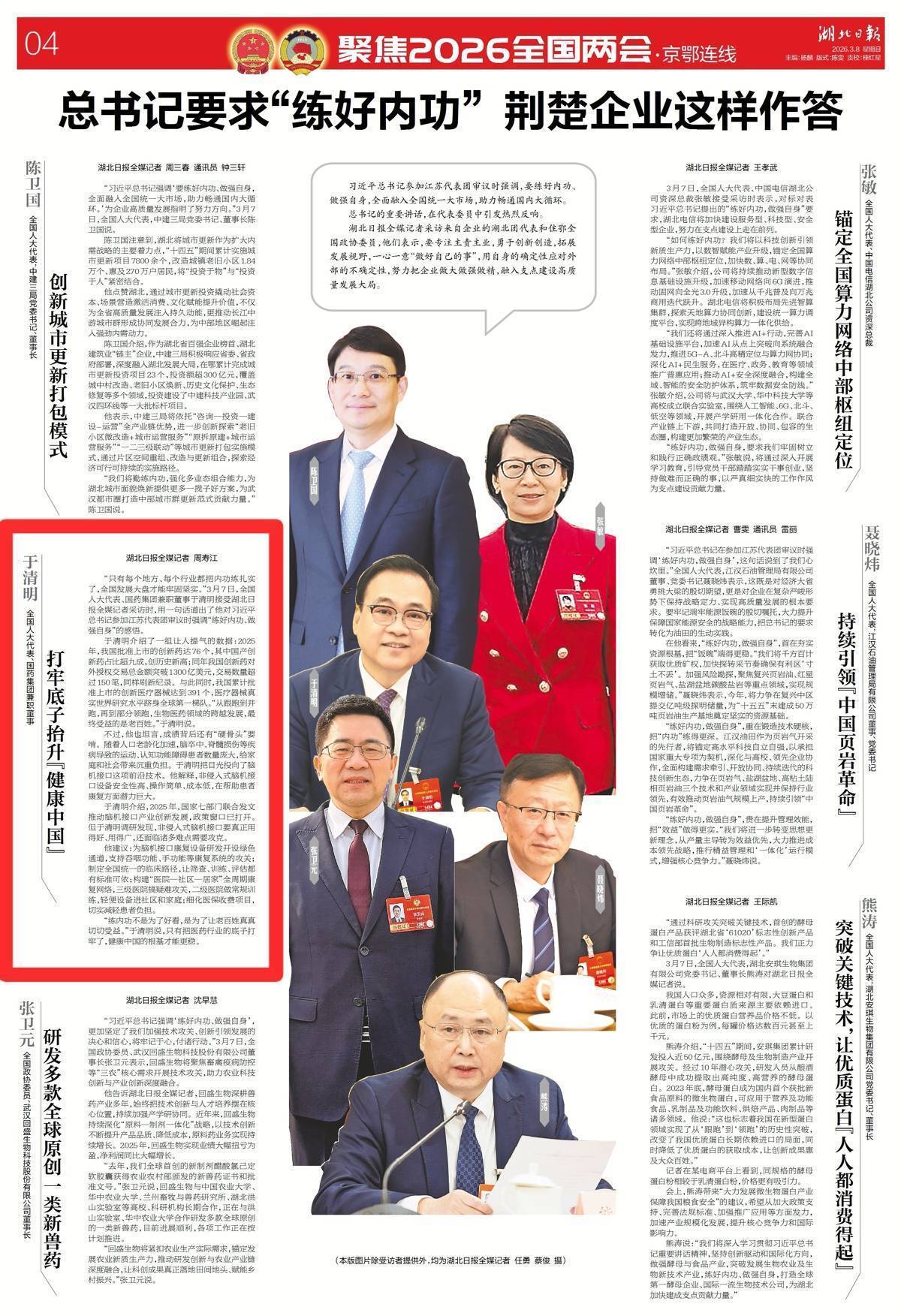 “只有每个地方、每个行业都把内功练扎实了,全国发展大盘才能牢固坚实。”3月7日,全国人大代表、国药集团兼职董事于清明接受湖北日报全媒记者采访时,用一句话道出了他对习近平总书记参加江苏代表团审议时强调“练好内功、做强自身”的感悟。